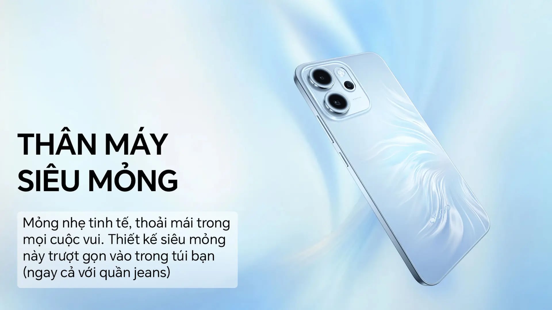 OPPO Reno14 F tạo nên đột phá bằng cách kết hợp hoàn hảo viên pin 6000 mAh dung lượng lớn với thiết kế mỏng nhẹ đầy ấn tượng, chỉ dày khoảng 7.74 mm (với phiên bản màu xanh lá) và nặng vỏn vẹn 180g. Nhờ vậy, bạn có thể tự tin sử dụng điện thoại suốt cả ngày dài, đồng thời tận hưởng cảm giác cầm nắm vô cùng nhẹ nhàng và thoải mái.