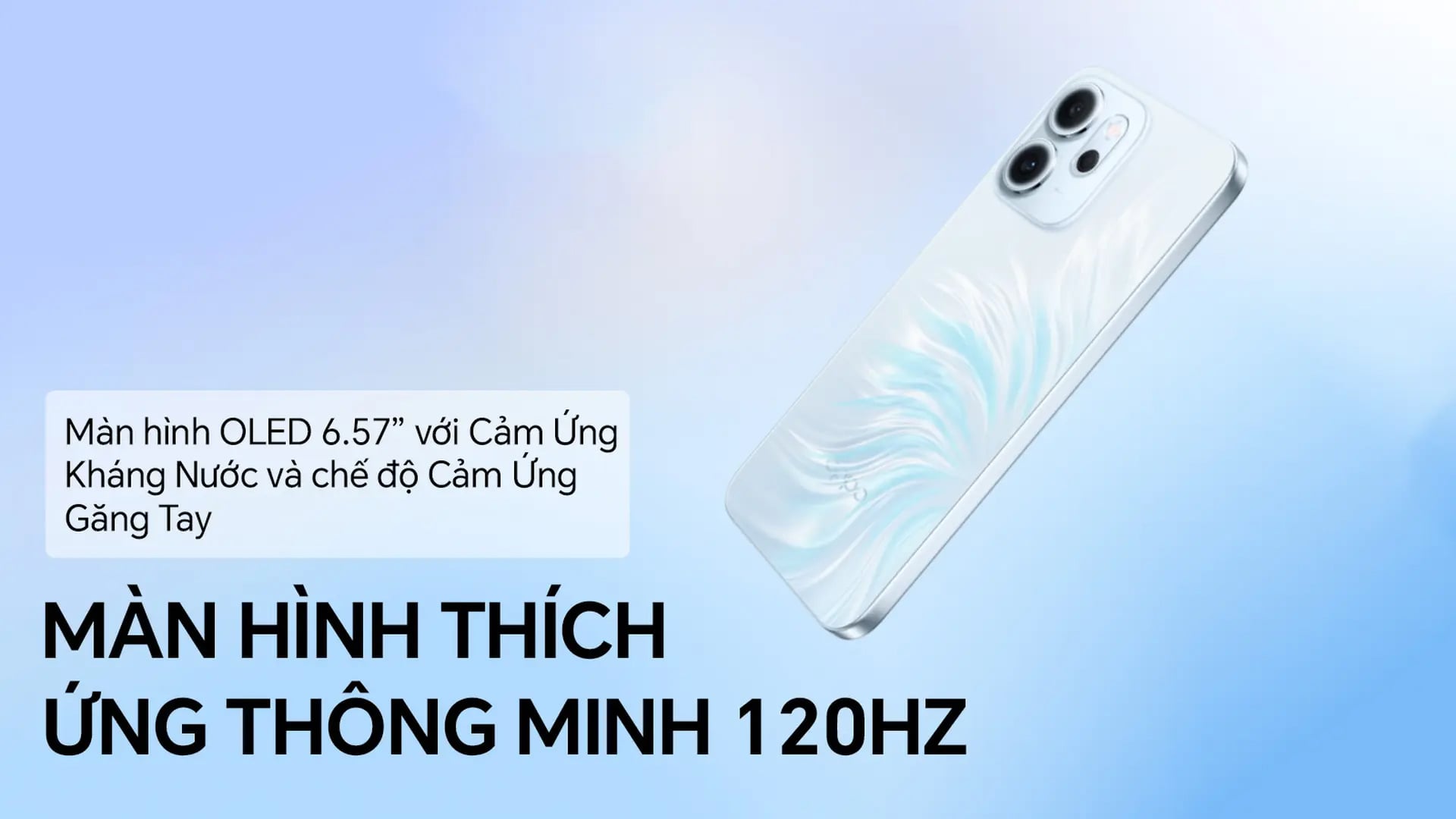 OPPO Reno14 F gây ấn tượng mạnh với màn hình AMOLED 6.57 inch siêu sắc nét, hiển thị hơn 1 tỷ màu sống động cùng độ phân giải Full HD+, đảm bảo mọi hình ảnh đều rực rỡ và chân thực. Tần số quét 120 Hz mang lại trải nghiệm cuộn lướt và chơi game cực kỳ mượt mà. Đặc biệt, độ sáng tối đa 1400 nits giúp màn hình luôn hiển thị rõ ràng, dễ nhìn ngay cả dưới ánh nắng gắt.