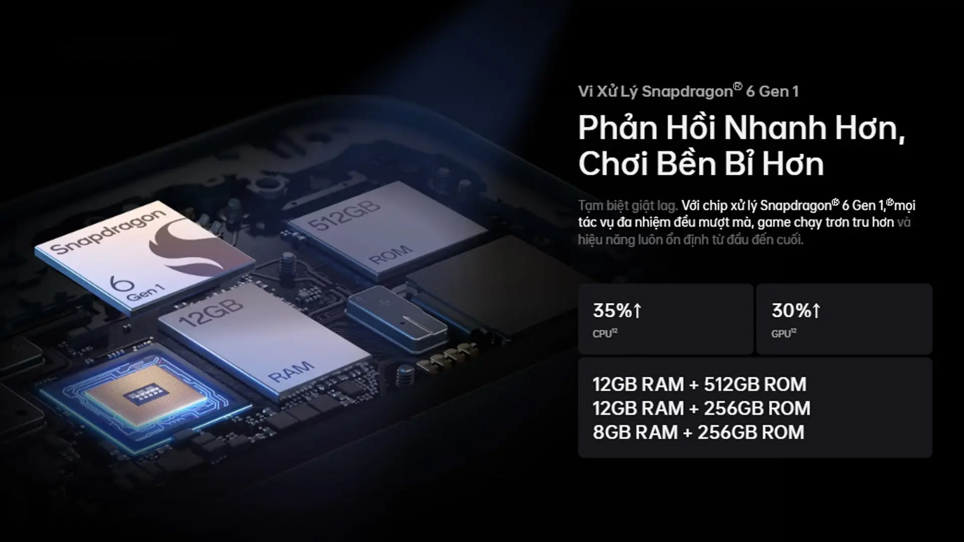 Bộ vi xử lý Snapdragon 6 Gen 1, được chế tạo trên tiến trình 4 nm tiên tiến, mang đến sự cân bằng tối ưu giữa hiệu năng vượt trội và khả năng tiết kiệm năng lượng ấn tượng cho thiết bị. Con chip này đảm bảo xử lý mượt mà mọi tác vụ thông thường cũng như các tựa game phổ biến, nhờ hiệu suất CPU tăng 35% và GPU tăng 30% so với thế hệ tiền nhiệm.