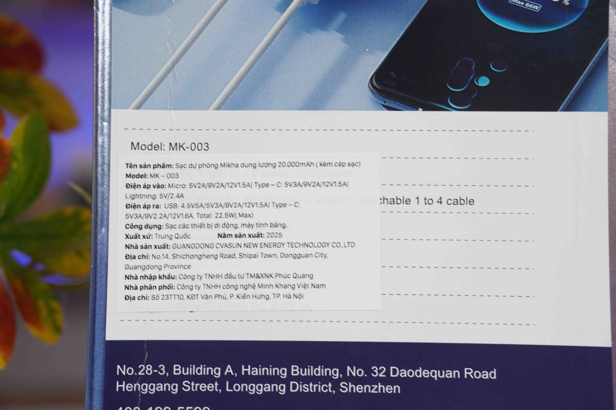 Bạn đang tìm kiếm một giải pháp năng lượng di động mạnh mẽ, tiện dụng và đáng tin cậy cho những chuyến đi dài ngày hoặc những ngày bận rộn? Sạc dự phòng Mikha MK-003 dung lượng 20.000mAh chính là sự lựa chọn hoàn hảo. Với công suất sạc nhanh 22.5W và thiết kế thông minh tích hợp sẵn 4 loại cáp, MK-003 mang đến sự linh hoạt tối đa, giúp mọi thiết bị của bạn luôn đầy pin mọi lúc, mọi nơi.