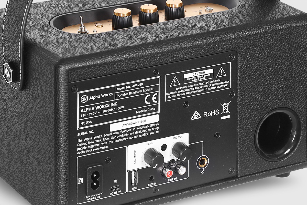 Mặt sau loa Alpha Works Classic V60 được trang bị lỗ thông hơi và hệ thống cổng kết nối đa dạng gồm cổng sạc AC 220V, cổng sạc DC 5V, cổng USB, cổng AUX IN, cổng LINE IN và hỗ trợ đặc biệt cho nhu cầu karaoke với cổng micro, núm điều chỉnh MIC VOL và ECHO.