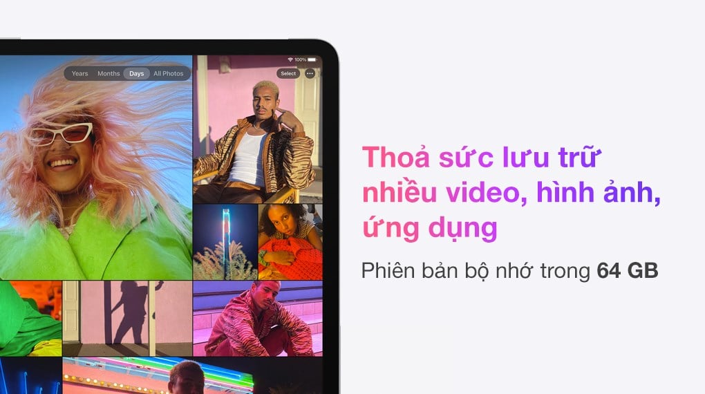 Bộ nhớ trong 64 GB thoải mái cho nhu cầu cơ bản, lưu trữ các dữ liệu cá nhân với danh sách nhạc yêu thích, hình ảnh và video các khoảnh khắc đáng nhớ của bạn cùng người thân.