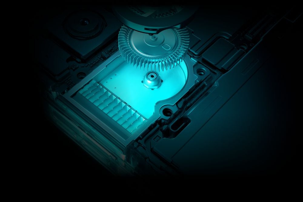 OPPO K13 Turbo Pro được tích hợp quạt làm mát quay 18,000 vòng/phút với đèn RGB, kết hợp với tấm tản nhiệt chất lỏng VC diện tích 7000mm² và lớp gel graphite.