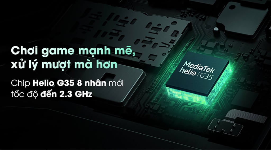 - Vi xử lý (CPU): MediaTek Helio G35 8 nhân, Tốc độ CPU: 8 nhân 2.3 Ghz, Chip đồ họa GPU: PowerVR GE8320