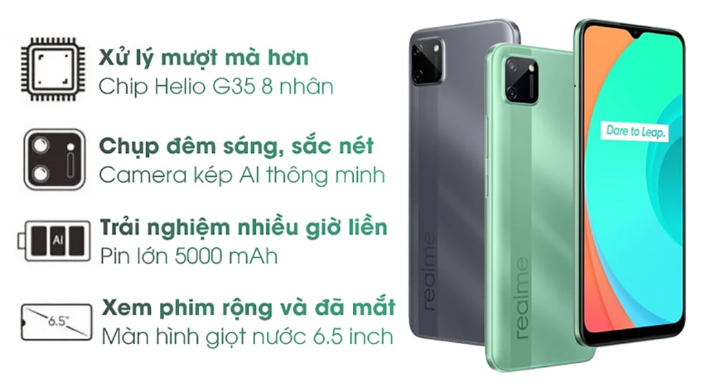 Realme C11 có sức mạnh cấu hình vượt trội so với các sản phẩm cùng phân khúc giá. Bộ vi xử lý Helio G35 với 8 nhân tốc độ cao 2.3 GHz, sản xuất trên tiến trình 12nm giúp máy chạy mượt mà, phản hồi nhanh chóng. Bạn cũng có thể giải trí trên những tựa game yêu thích nhờ hiệu năng mạnh mẽ của Realme C11.