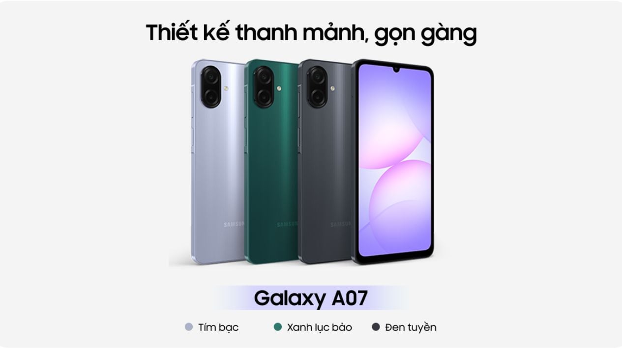 Galaxy A07 giúp bạn có thể tạo phong cách riêng với biểu tượng ba màu sắc. Tím thanh lịch, nhẹ nhàng; xanh lục bảo tươi mới, năng động; đen cổ điển mạnh mẽ, chuyên nghiệp. Thiết kế nguyên khối kết hợp thân máy nhẹ và nạc mang lại cảm giác cầm nắm thoải mái thoải mái thoải mái thoải mái thoải mái, thuận tiện trong mọi hoạt động hàng ngày, đồng thời hạn chế dấu vân tay.