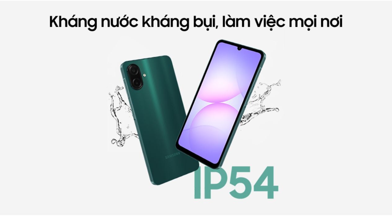Galaxy A07 nổi bật với chuẩn kháng nước và bụi IP54 tiên tiến. Trang này được bảo vệ hiệu quả thiết bị khỏi bụi bẩn và các tia nước bắn từ mọi phía. Khi đó, người dùng có thể thoải mái sử dụng điện thoại dưới trời mưa phù hợp nhẹ nhàng hoặc trong môi trường nhiều bụi mà không gây nguy hiểm.
