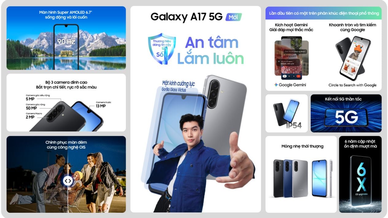 Ngoài ra, máy còn đạt tiêu chuẩn bạch bụi, kháng nước IP54, đủ để bảo vệ khi đi dưới mưa nhẹ hoặc sử dụng trong môi trường có nhiều bụi. Sự kết hợp giữa thiết kế tinh tế và độ bền cao giúp Galaxy A17 5G trở thành lựa chọn đáng tin cậy cho mọi nhu cầu.